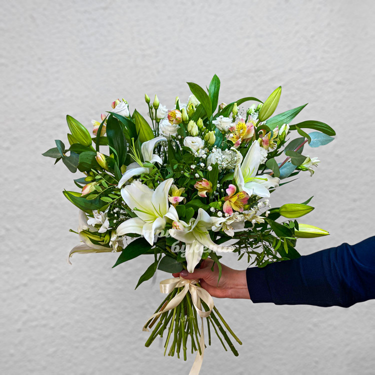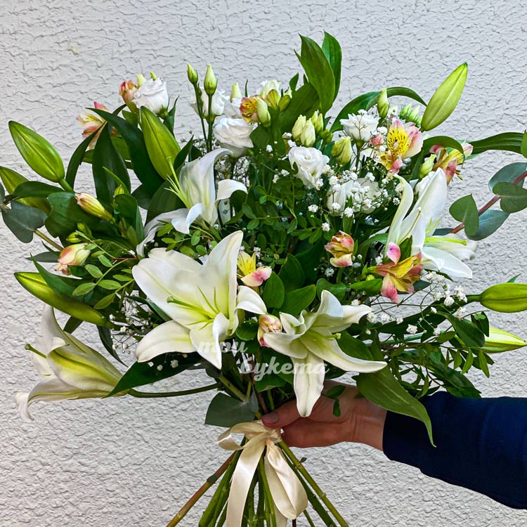 Букет белых лилий и альстромерий с зеленью