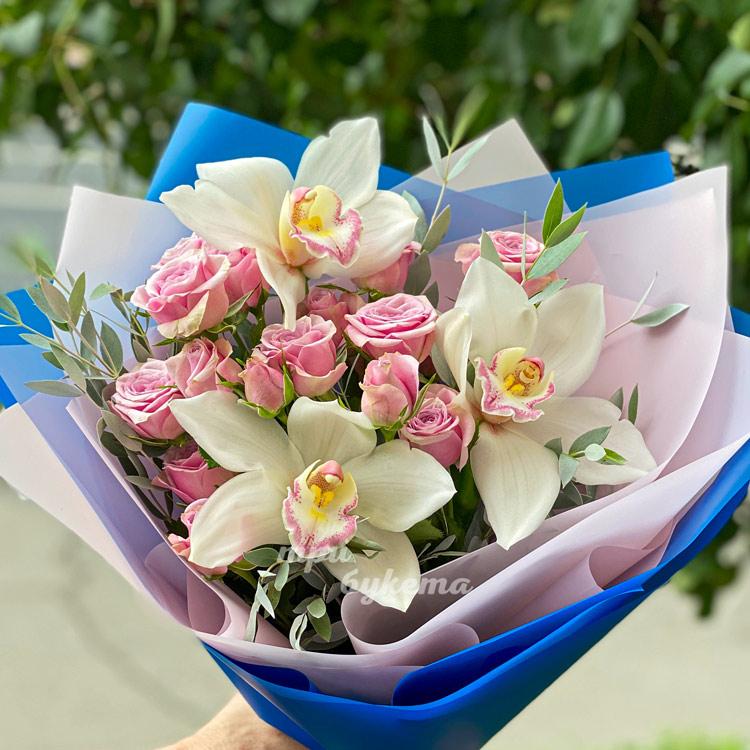 Букет белых орхидей и розовых куст. роз