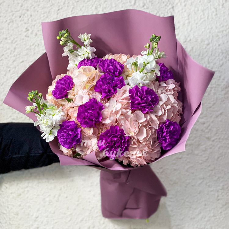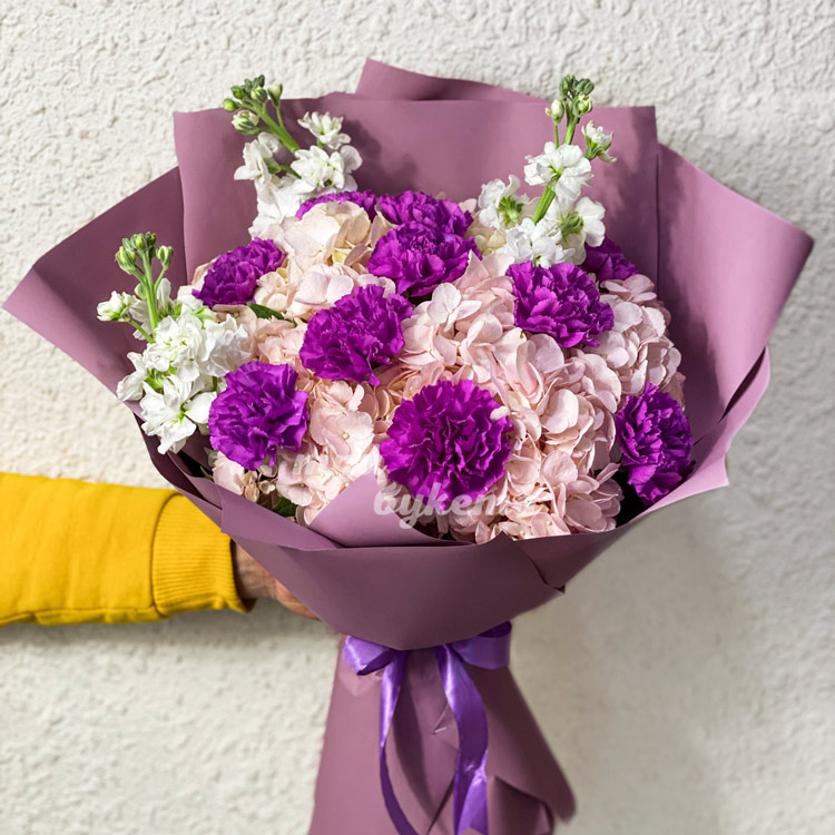 Букет гортензий, гвоздик и маттиол