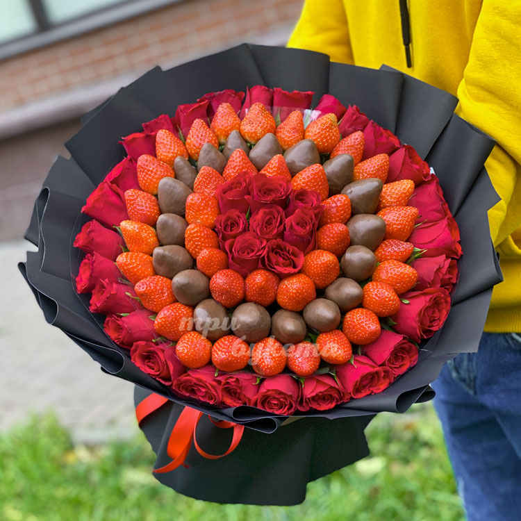 Букет из красных роз и клубники