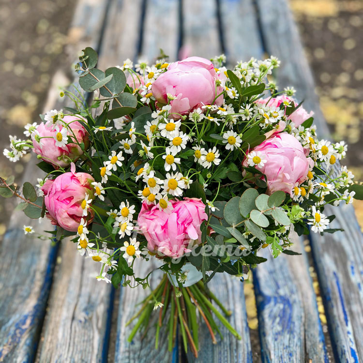 Букет из розовых пионов с ромашками