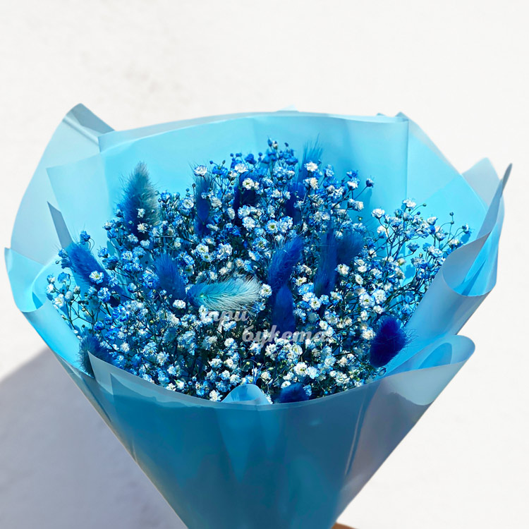 Букет из синих гипсофил и лагуруса
