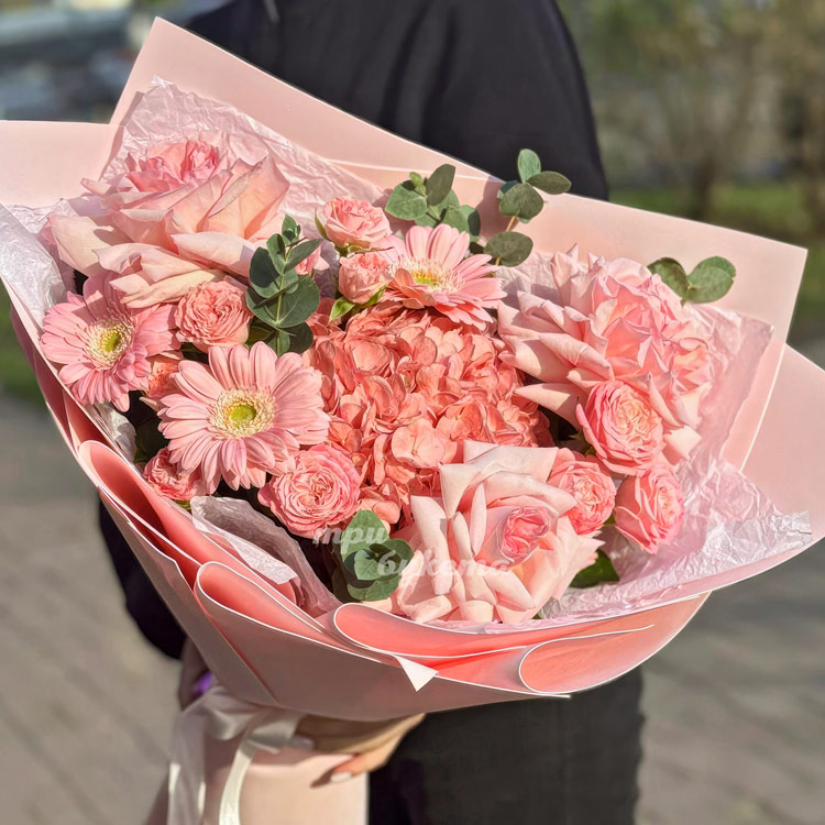 Букет нежно-розовых роз с герберами