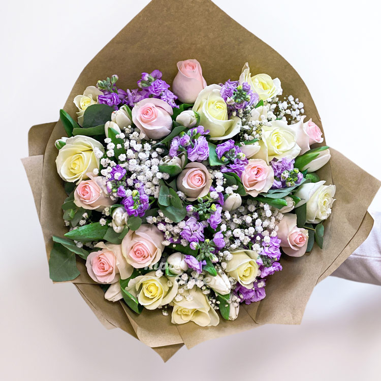 Букет нежных маттиол, тюльпанов и роз