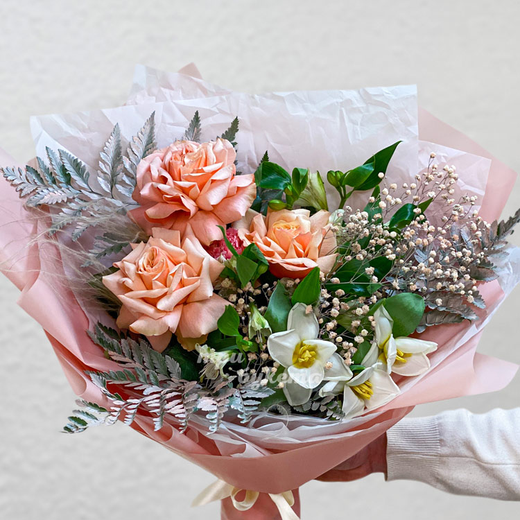 Букет персиковых роз с белыми нарциссами
