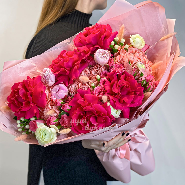 Букет розовых роз, пионов и гортензий