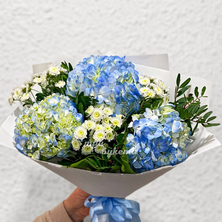 Букет синих гортензий и белых хризантем