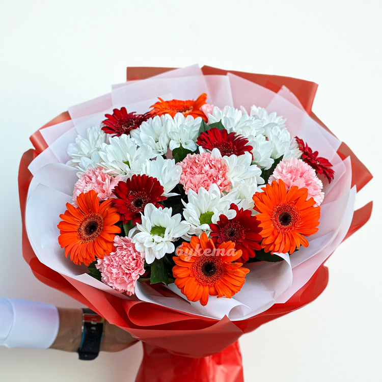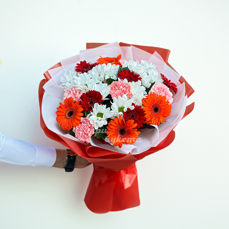 Букет ярких гербер и гвоздик с хризантемами