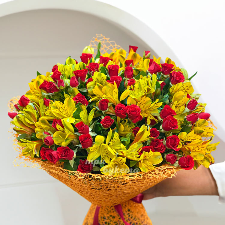 Букет желтых альстромерий и красных роз