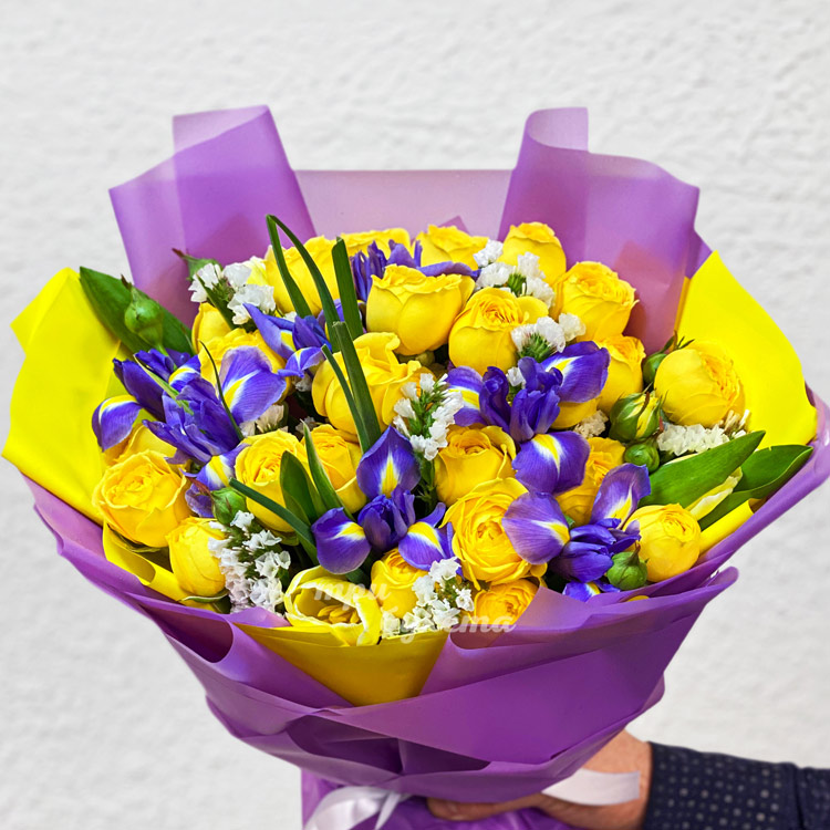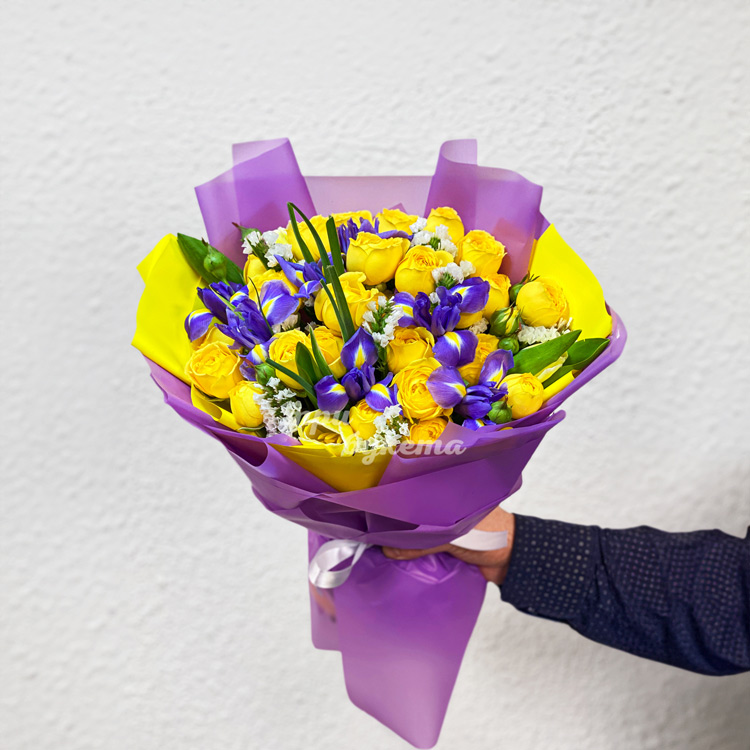 Букет желтых кустовых роз и ирисов