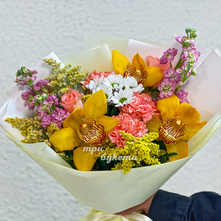 Букет желтых орхидей и коралловых гвоздик