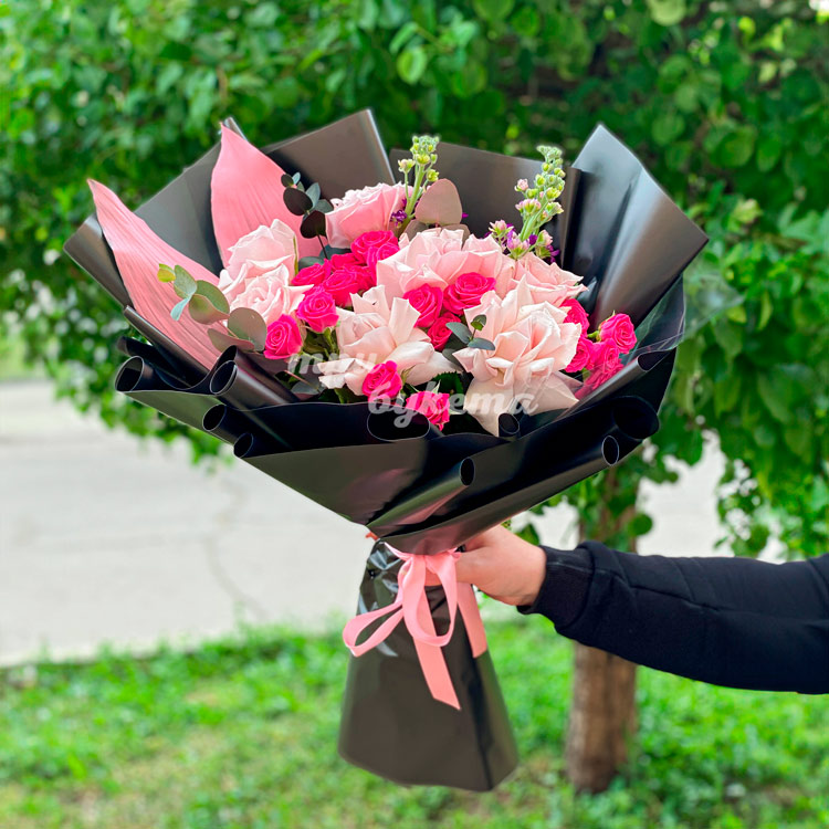 Черный букет из розовых роз и маттиолы