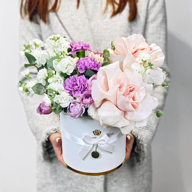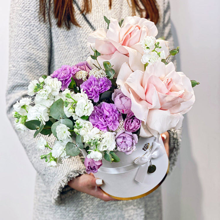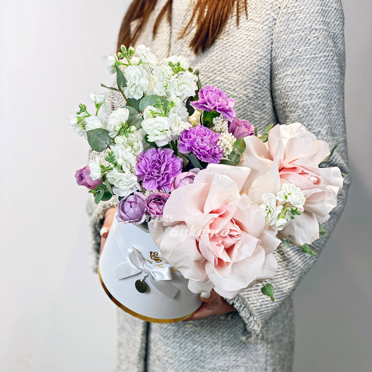Коробка белых маттиол и сиреневых гвоздик