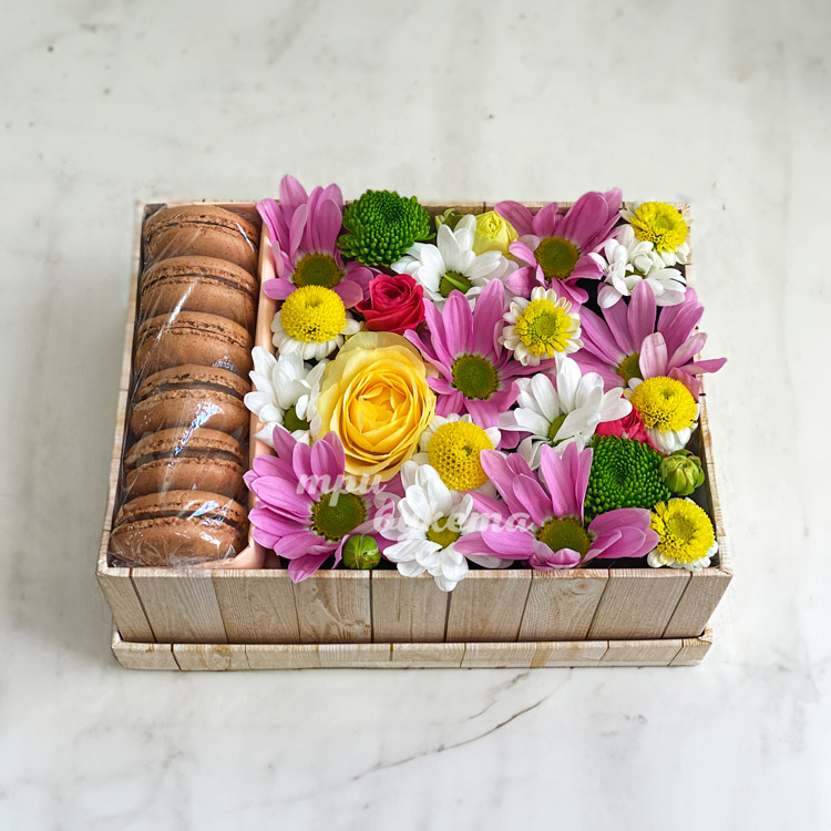 Коробка из 6 макарун, хризантем и роз