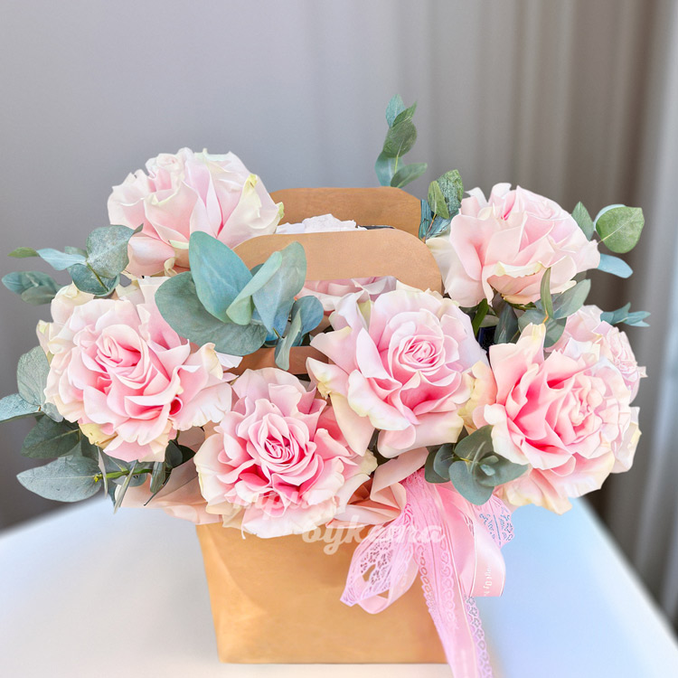Коробочка с розовыми розами и эвкалиптом