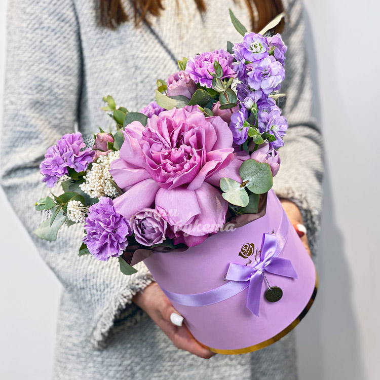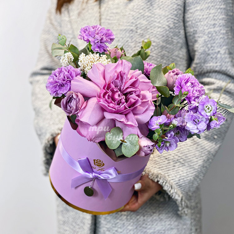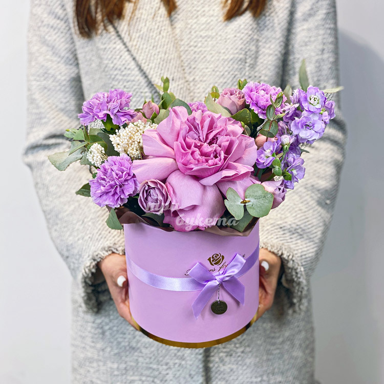Коробочка сиреневых гвоздик и роз