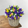 Корзина белых хризантем, орхидей и эустом