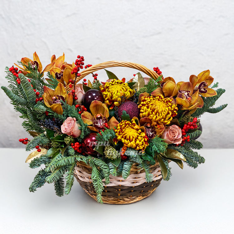 Корзина с новогодним декором и цветами