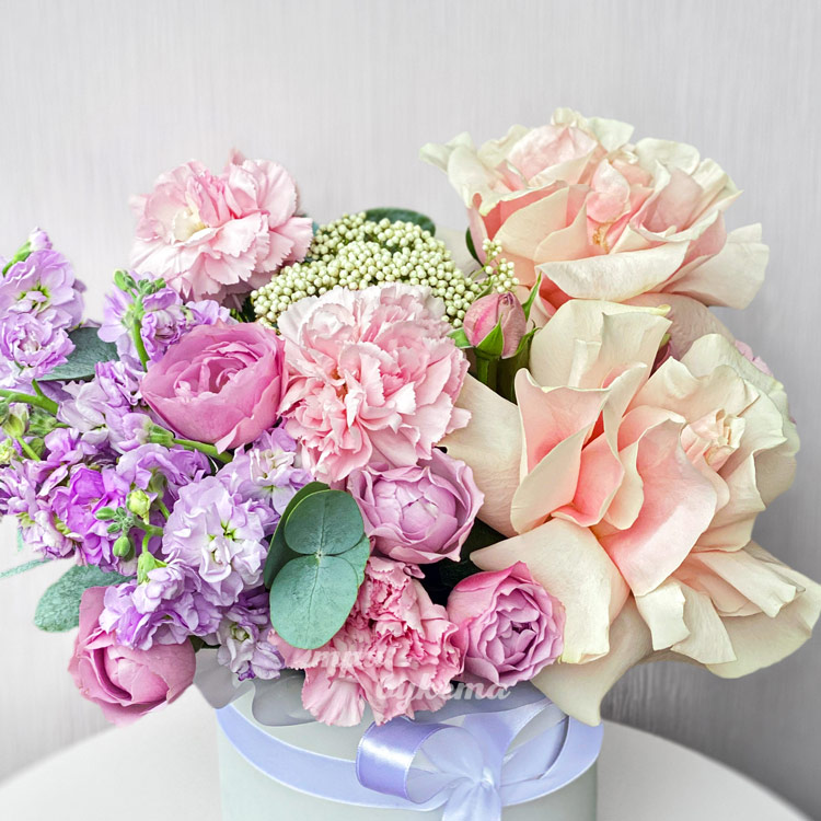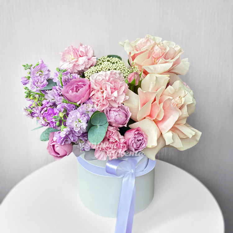 Мини-коробка нежных роз, маттиол и гвоздик
