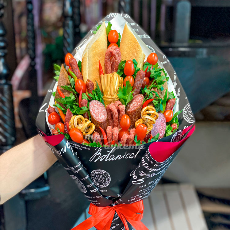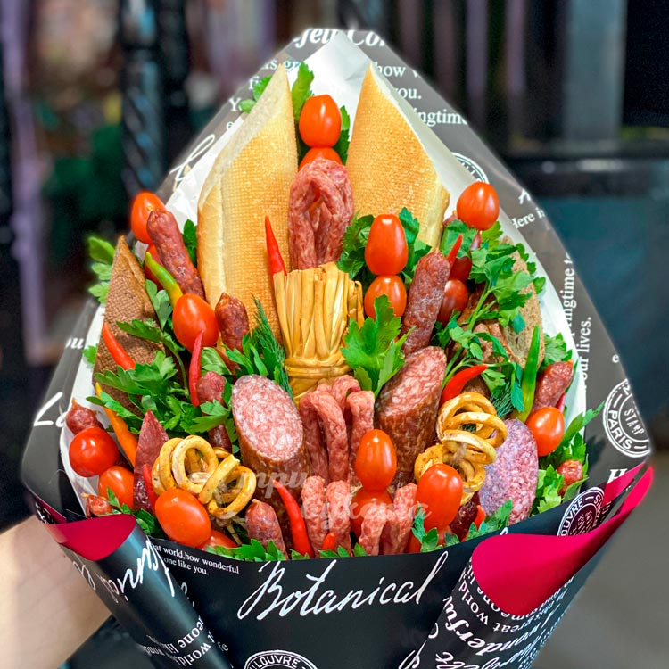 Мужской букет из колбасок и томатов