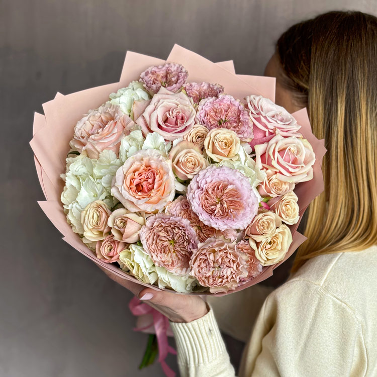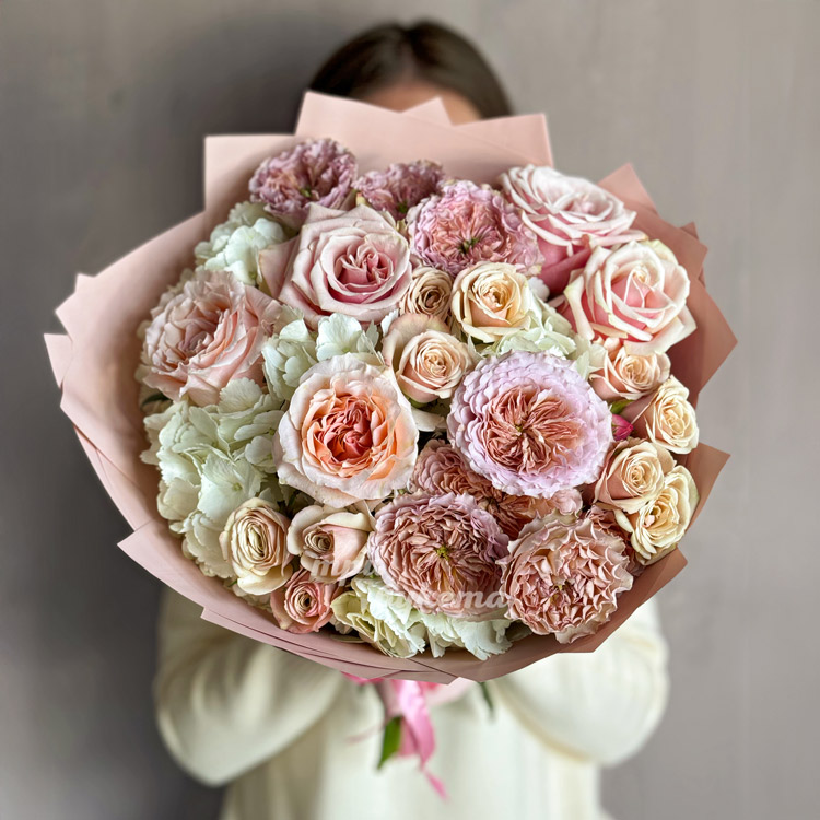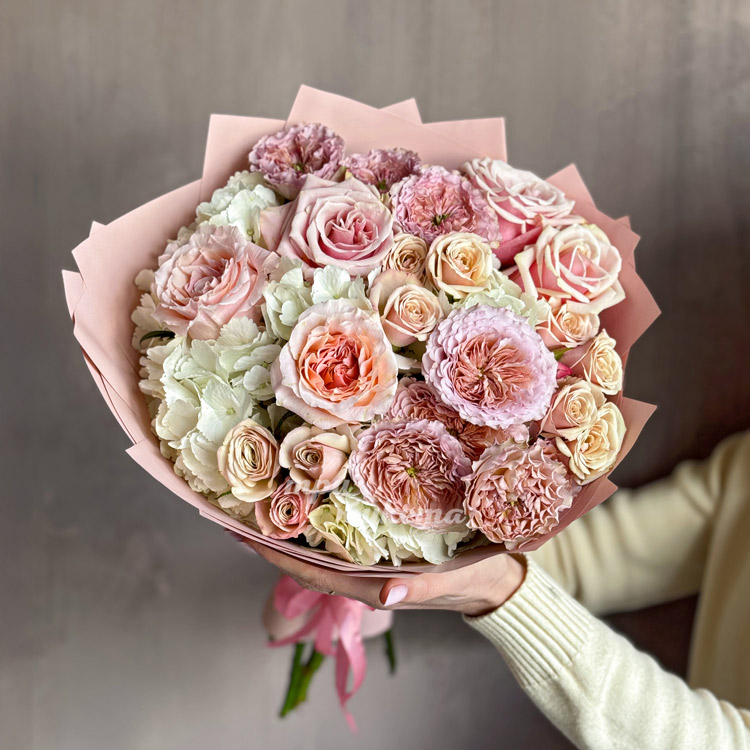 Нежно-розовый букет пионовидных и кустовых роз