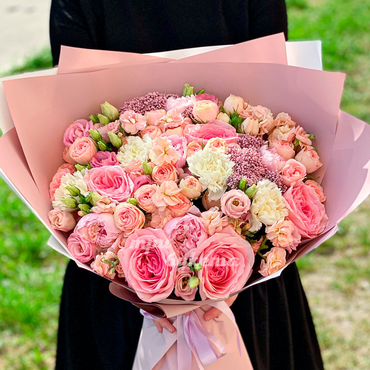 Розовый букет из пионов, роз и маттиол