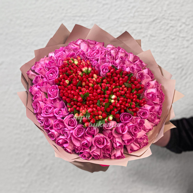 Сердце из ягод гиперикума в розовых розах