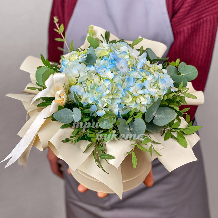 Синяя гортензия в шляпной коробке